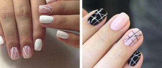 - Геометрический френч делается с линией улыбки в виде “ласточкиного хвоста”. Уголок рисуется быстро прямыми линиями и выглядит очень необычно.
