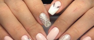 Красивый маникюр на длинные ногти получается при сочетании розового с белым, бежевым и блестящими гель лаками.