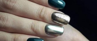 Темно-зеленый маникюр с блестками на коротких ногтях