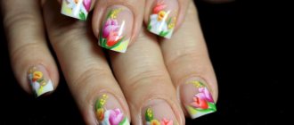 - Firstly, the design with large flowers. Such a manicure will look especially relevant in the summer, when you want to create light but interesting images. Patterns with flowers can be selected from the master.