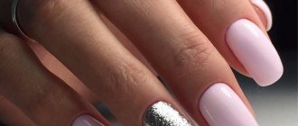 Glitter can be used on both transparent nails and those coated with colored gel polish. If you choose glitter that is a shade darker than the coating, you can create a beautiful stretch of color. To obtain a gradient, glitter is applied from the tip of the nail to the center or from the lunula to the middle of the plate, adjusting the coverage density. The glitter is applied to the center of the nail with light strokes, and to the lunula or tip - in a thick layer. In the photo below you can see a beautiful pink manicure with glitter in ombre style.