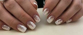 A combination of polishes in one shade (one glowing, the other not) looks appropriate in any situation. During the day, you show off a stylish, modest manicure, and in the evening, parts of the nail brighten and reflect the light. The design can be anything - monograms, blocks, dots.