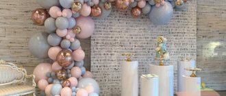 The simplest option for decorating a hall with balloons for an anniversary is to fill the ceiling with helium balloons, the main thing is not to forget to curl all the ribbons, because crumpled ribbons sticking out look careless and are unlikely to be a decoration. Fountains made of latex and foil balloons look very beautiful on a festive table. It is enough to create a composition of 3-5 pieces, secure it with a weight and distribute it pointwise on the table. One of the main conditions for a competent composition of balloons for an anniversary is the location above eye level. Otherwise it will block your view.
