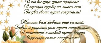 - The next toast belongs to the groom's parents. In it they can also express all their joy for their children. After all, now they have a new addition to their family - a daughter has appeared who will always be by their side, will bring happiness to their family in the form of long-awaited grandchildren and will take care of their son.