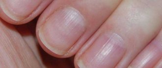 - Lack of vitamins (zinc, iron, copper, calcium, iodine). Very often, grooves appear in the spring, when the body lacks vitamins, and we often observe signs of vitamin deficiency. Under this circumstance, the nail not only becomes covered with grooves, but also becomes noticeably thinner. You can also observe the appearance of white spots on the nail plate. Often the nails begin to peel and crack, become very brittle and brittle, turning blue.