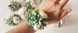 - Бутоньерка. Для ее создания необходимо выбирать бутоны цветов, входящих в состав букета невесты. Это позволяет единый образ пары молодоженов.