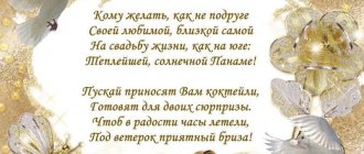 Я тебя поздравляю и ревную чуть-чуть. Будь счастливой во всем, но меня не забудь! Будь любимой без меры – без меры люби И на мужа обид никогда не копи.