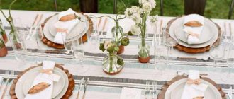 Антуража добавят расставленные на столах свечи, керосиновые лампы, а также салфетки, сделанные своими руками. Традиционные бутылки заменяются вазонами с цветами, фруктами и овощами местного сбора, а также украшаются колосьями пшеницы. Необычности придадут редкие растения, расставленные на поду в особых горшочках с землей, например, душистый горох.